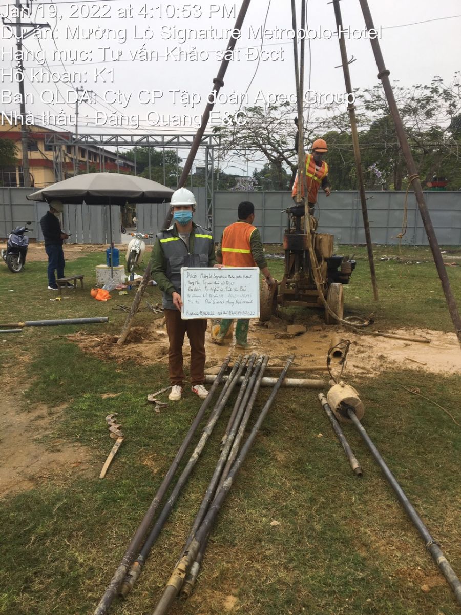 Các cán bộ khảo sát địa chất tiến hành khoan thăm dò bằng máy khoan chuyên dụng có thể là XY-1. Quá trình khoan thăm dò địa chất còn kết hợp lấy mẫu đất đem về phòng thí nghiệm và thí nghiệm xuyên tiêu chuẩn SPT (Standard penetration test) tại hiện trường. Cứ mỗi 2 mét khoan sẽ lấy 1 mẫu đất để thí nghiệm cơ lý, sau đó tiến hành đóng SPT hiện trường.